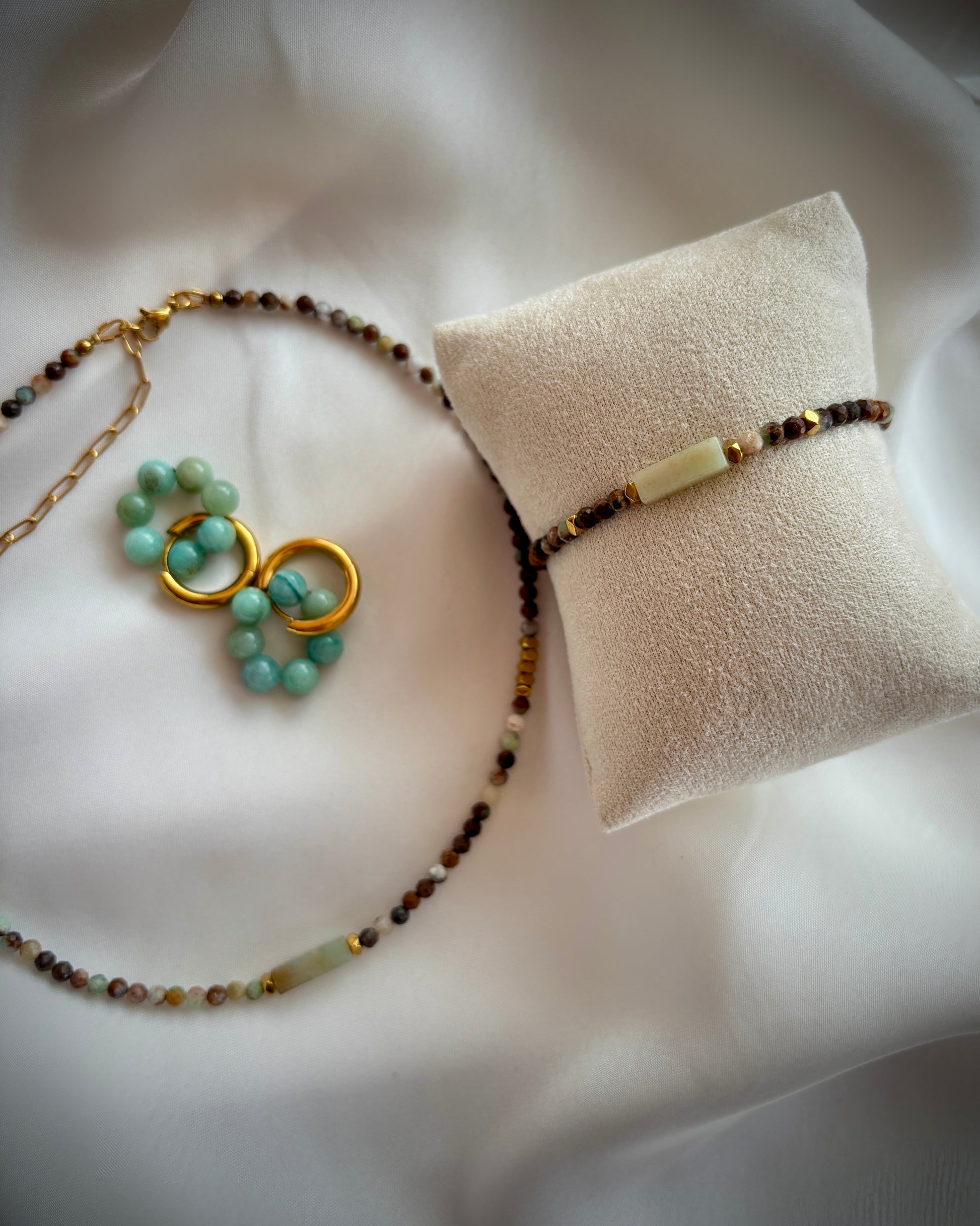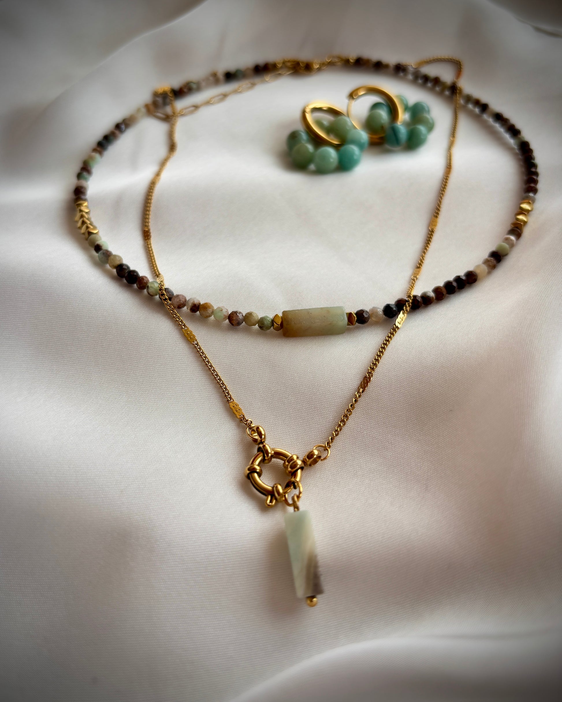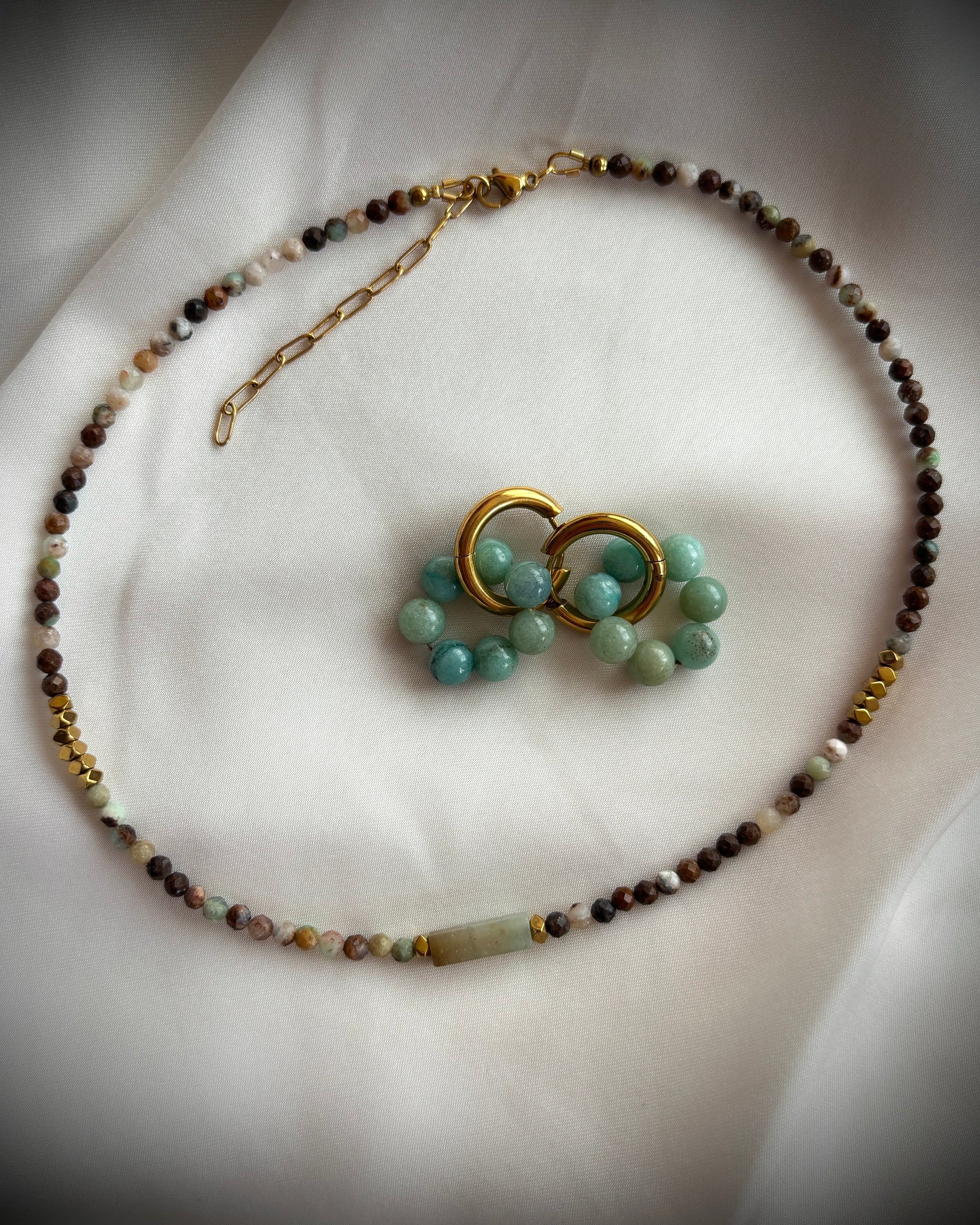 Колие с амазонит, хематит и стоманена закопчалка.
