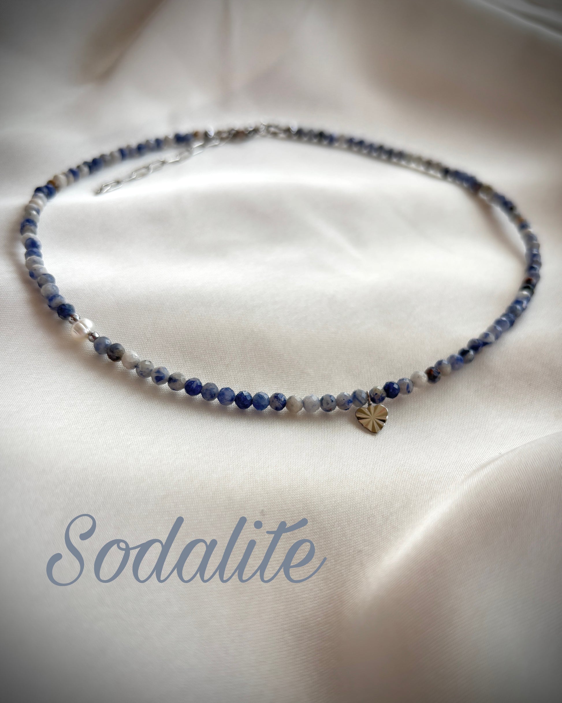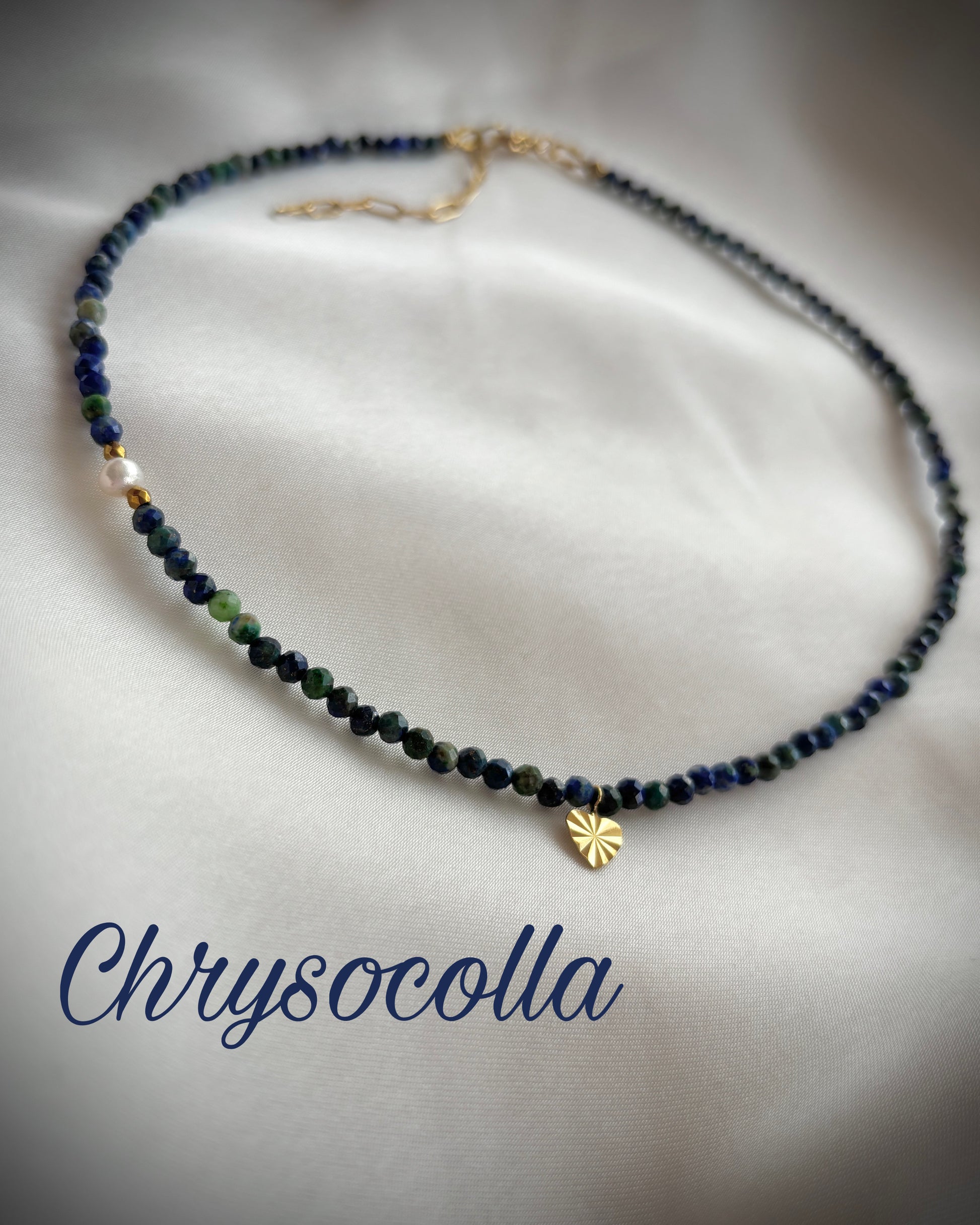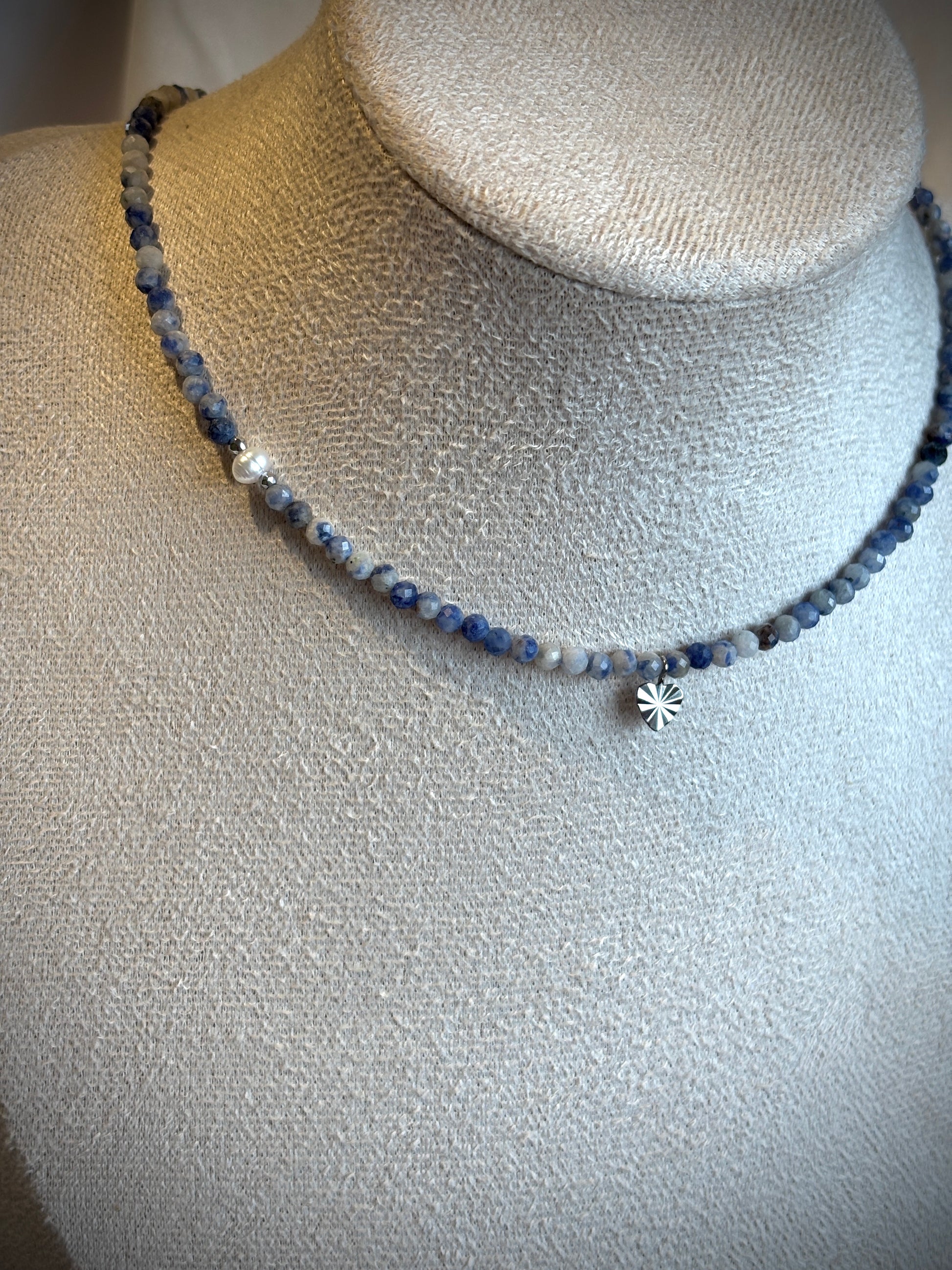 Колие със содалит/гранат/хризокола, перла, хематит и стоманена закопчалка.