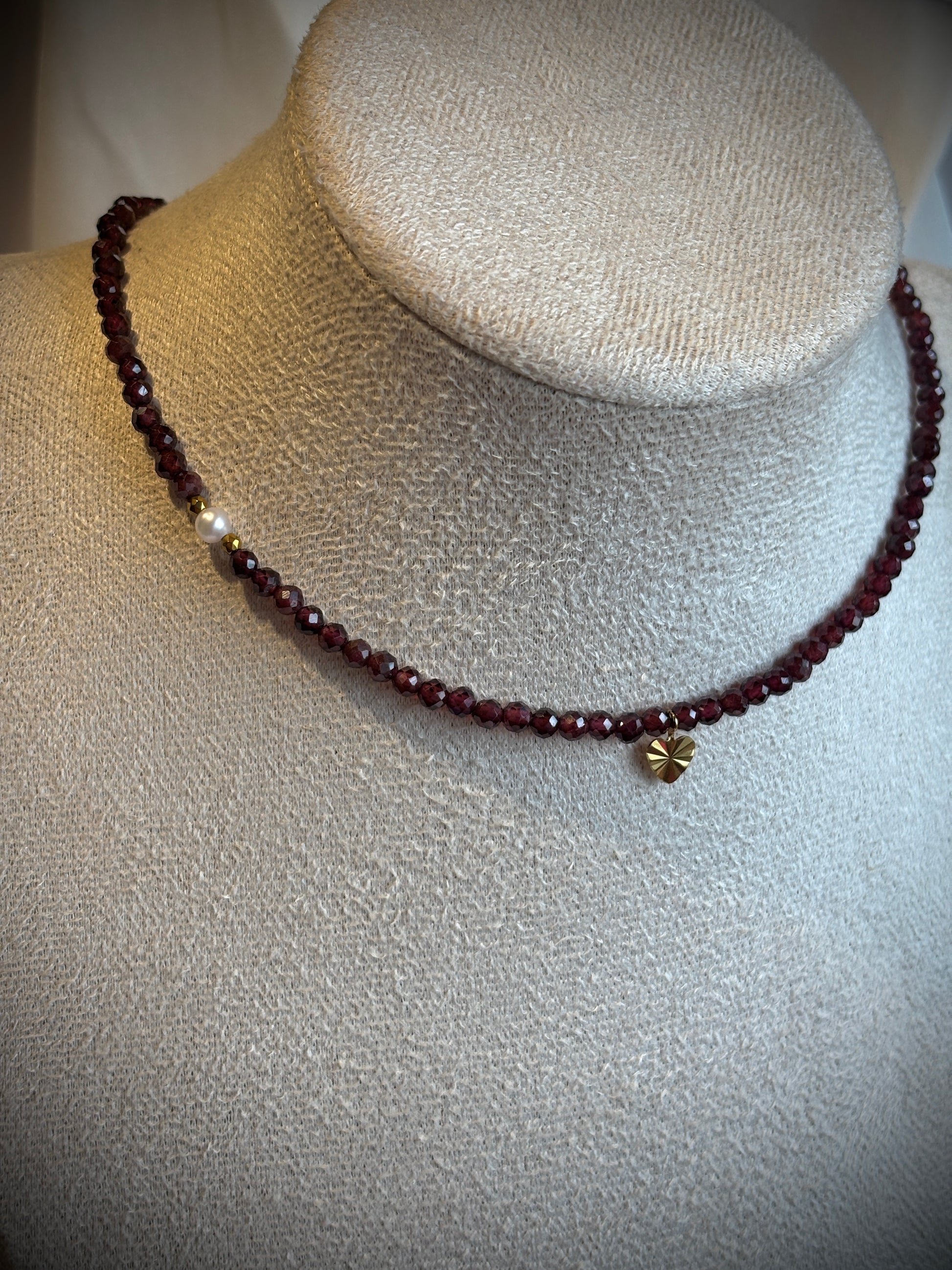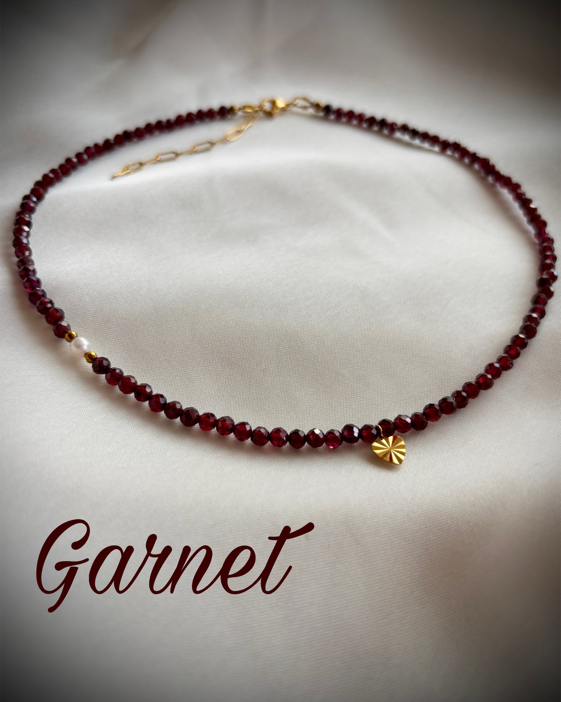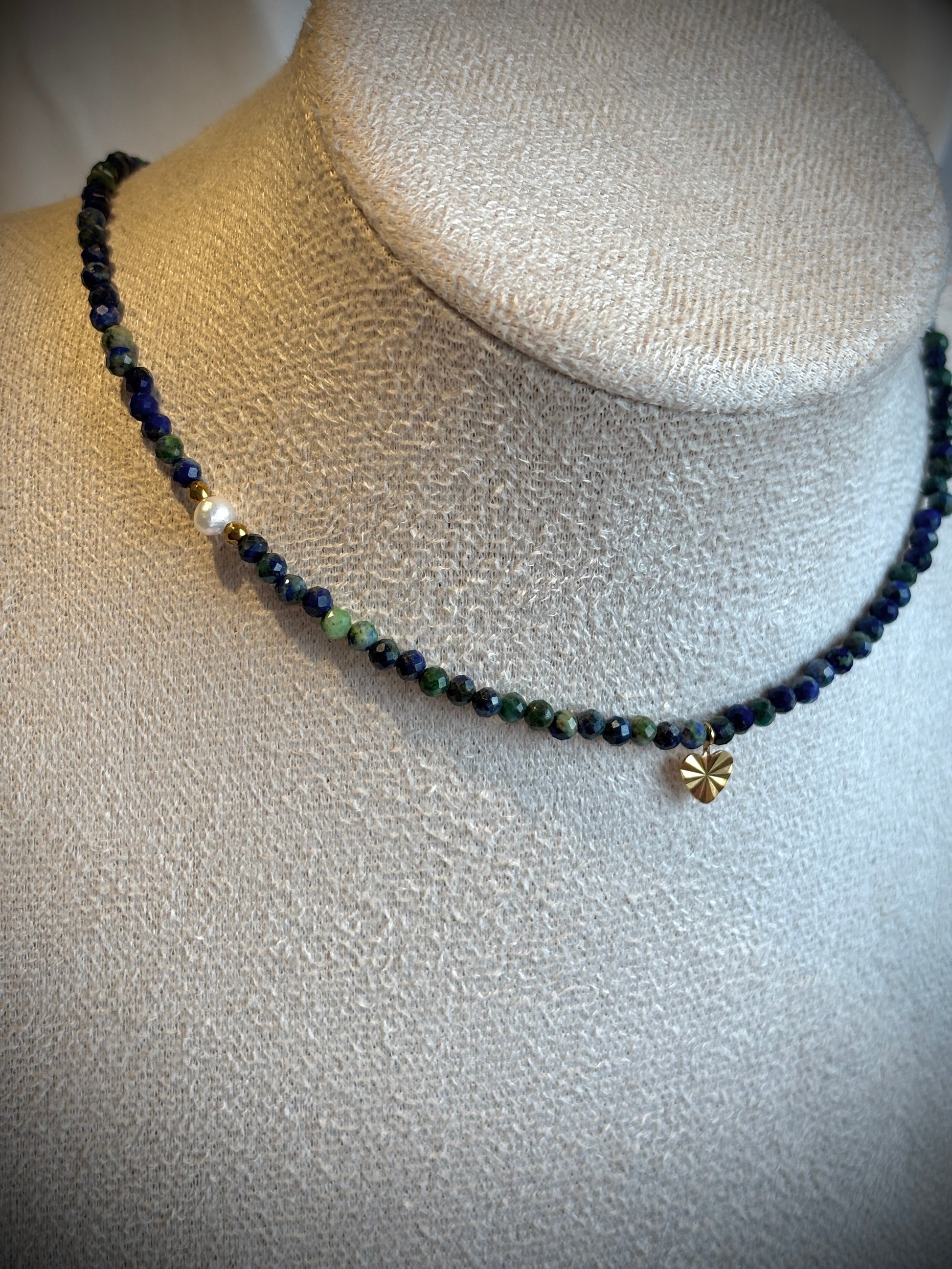 Колие със содалит/гранат/хризокола, перла, хематит и стоманена закопчалка.